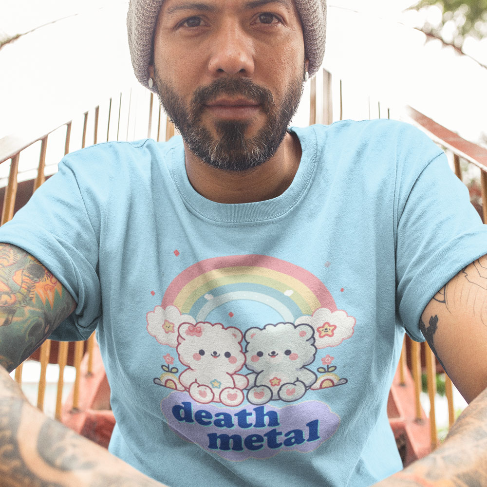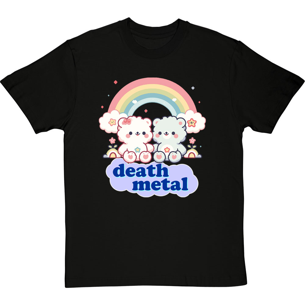 Featuring the juxtaposition of a pair of loved-up Kawaii bears, complete with rainbows and sparkles, with the words "death metal". Rock on.