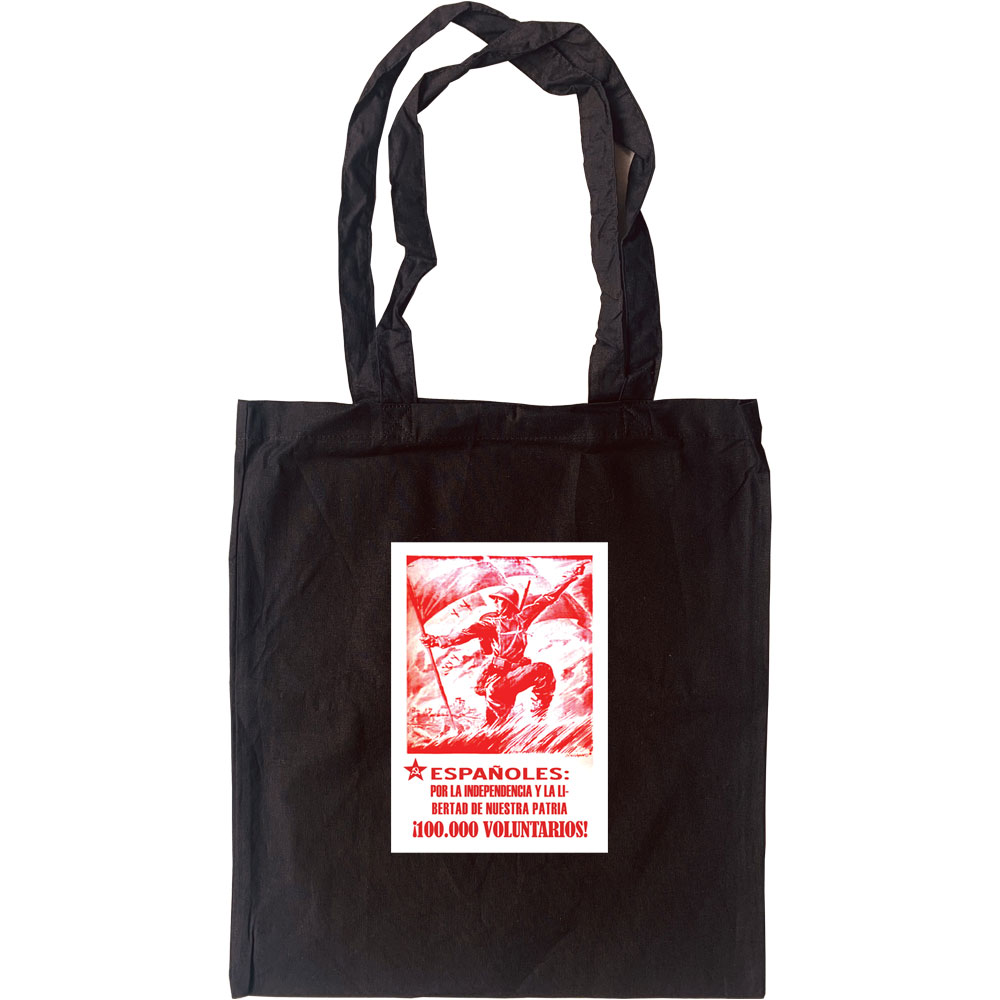 A Republican recruitment poster designed by Jose Bardasano during the Spanish Civil War. The slogan literally translates as: "Spanish for independence and the freedom of our country. 100,000 volunteers." Our design is printed on a 100% cotton, eco-friendly tote bag.