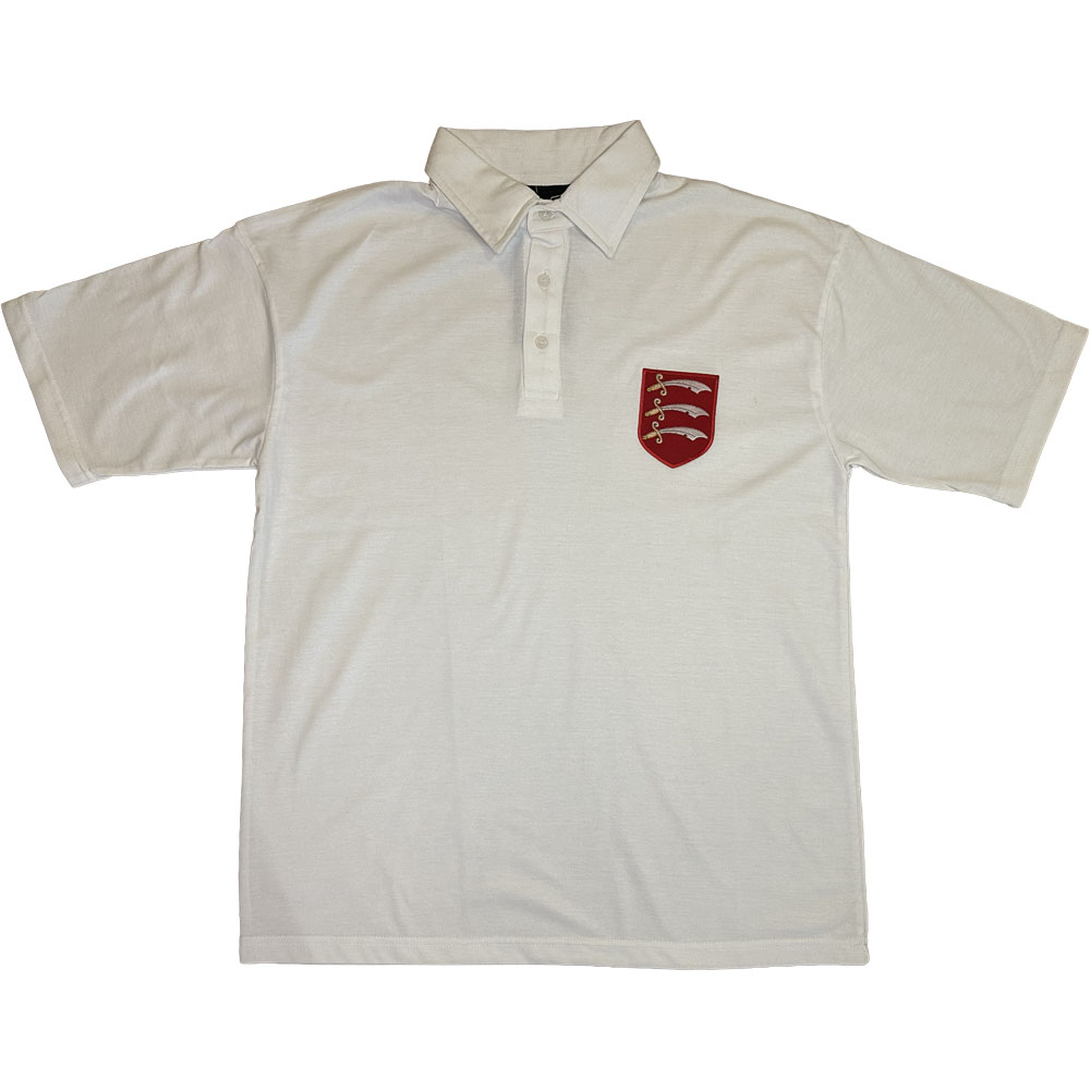 A high-cotton, retro-fit cricket shirt, featuring detailing from the Essex coat of arms: three silver notched swords, known as seaxes, with gold handles (hilts) arranged vertically on a red field.