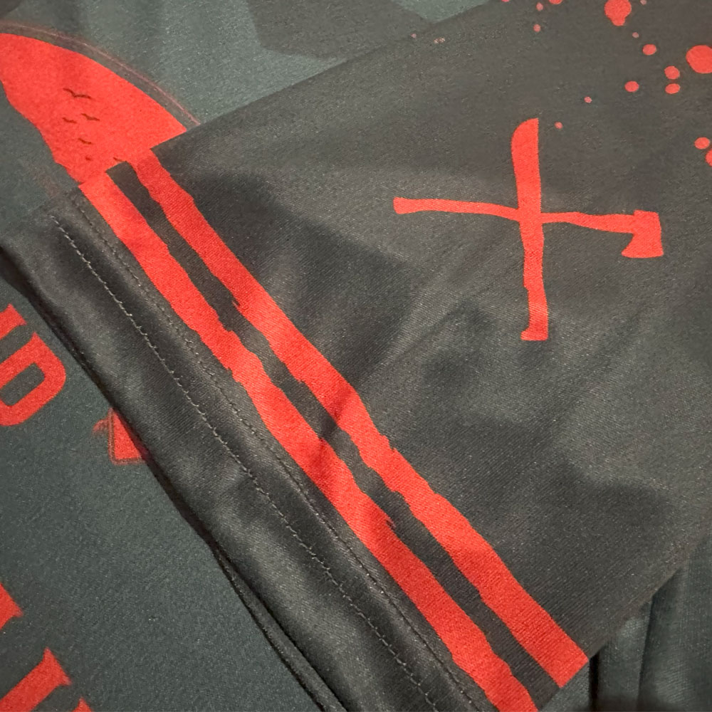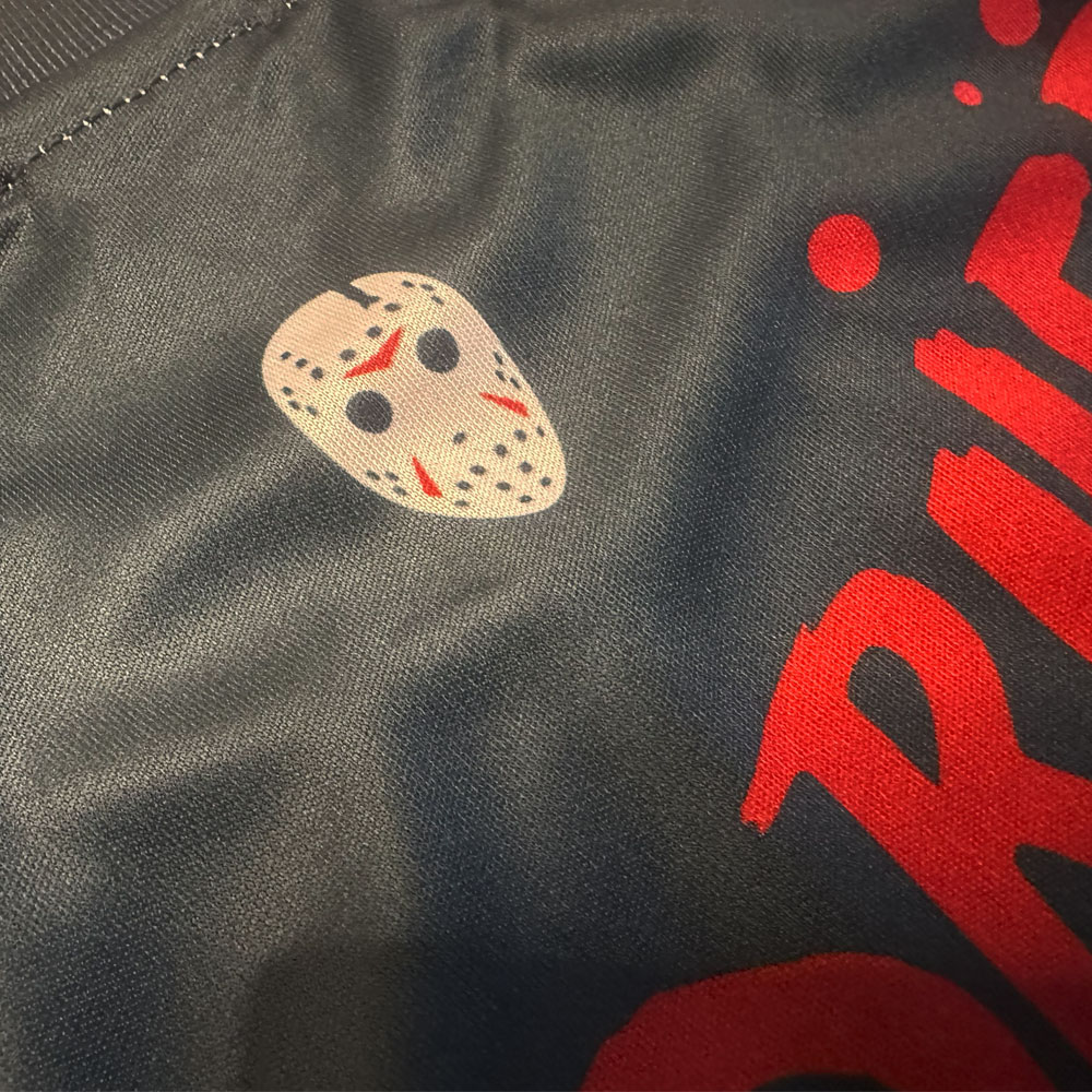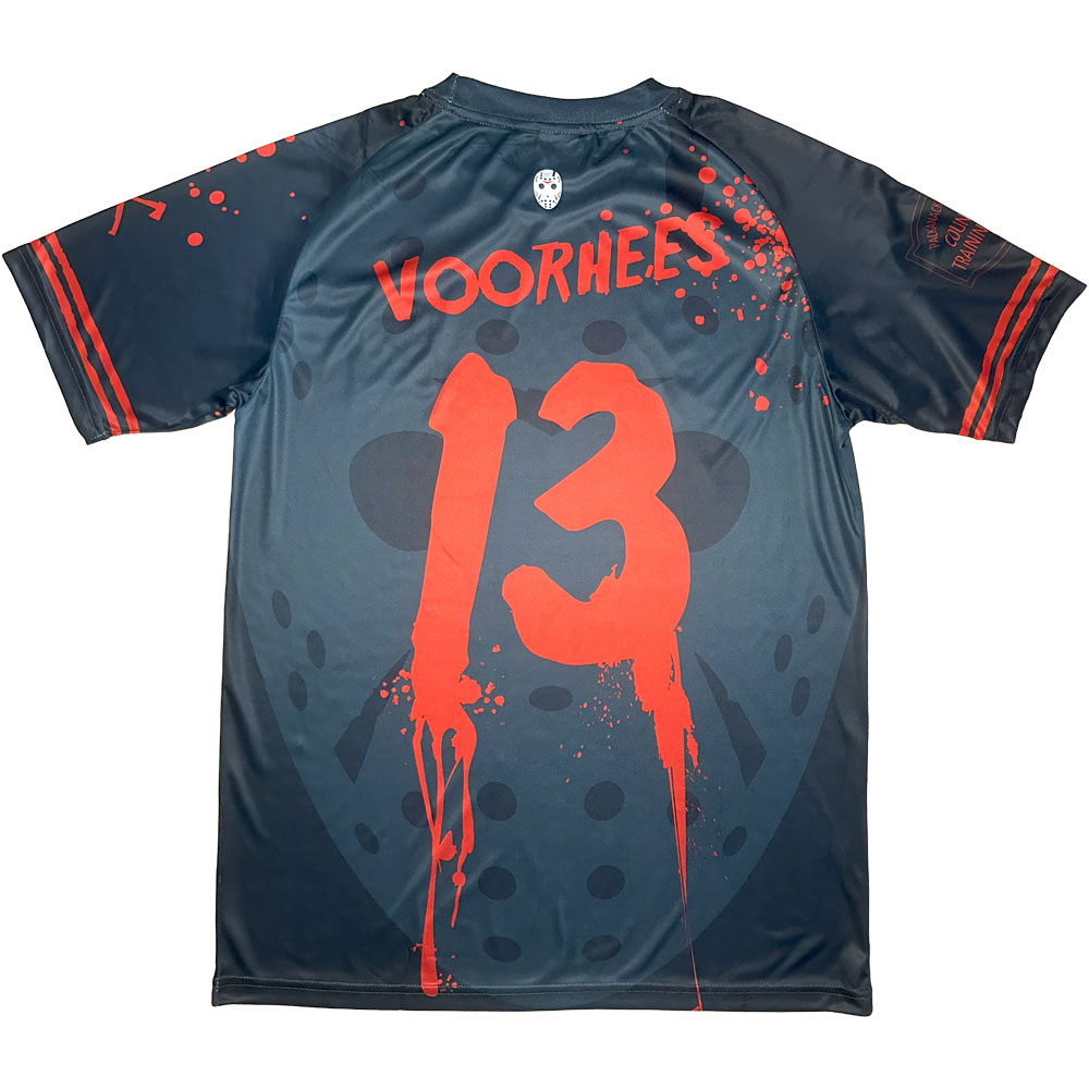 The front sponsor is Camp Crystal Lake, where the first film takes place and where Jason first “drowned”, while the sleeve sponsor is the logo of Packanack Lodge Counsellor Training Center where the second film takes place. The second sleeve has the same crossed hatchet and machete logo that appears on the badge. The rear of the shirt features the name Vorhees (Jason) and the number 13, whilst there are also numerous blood splatter patterns over various parts.