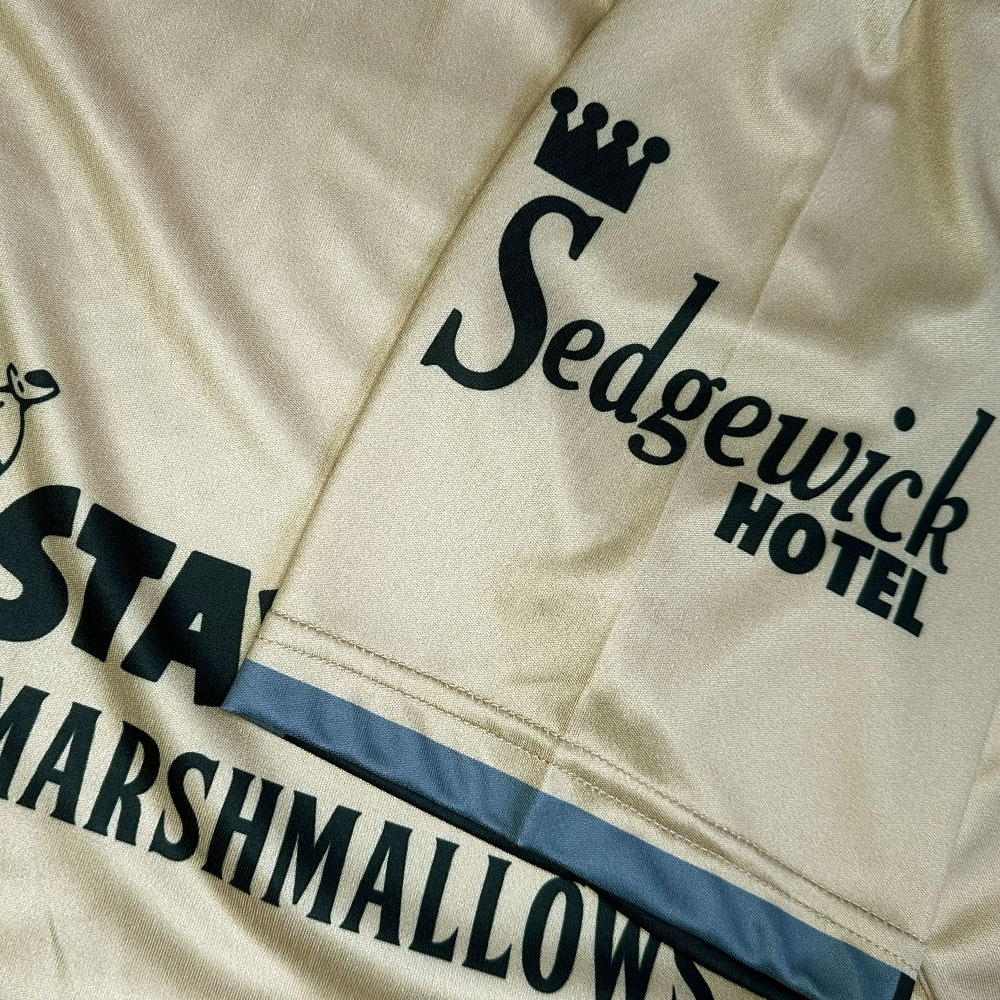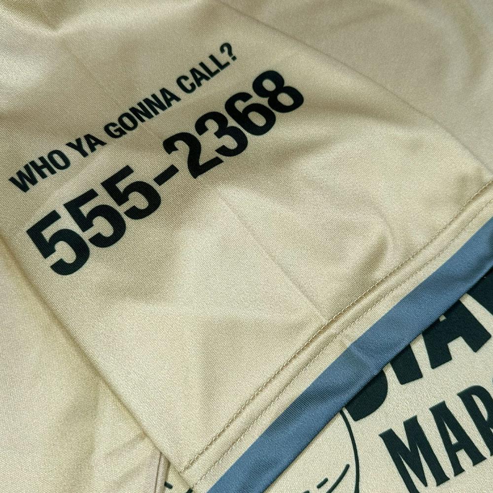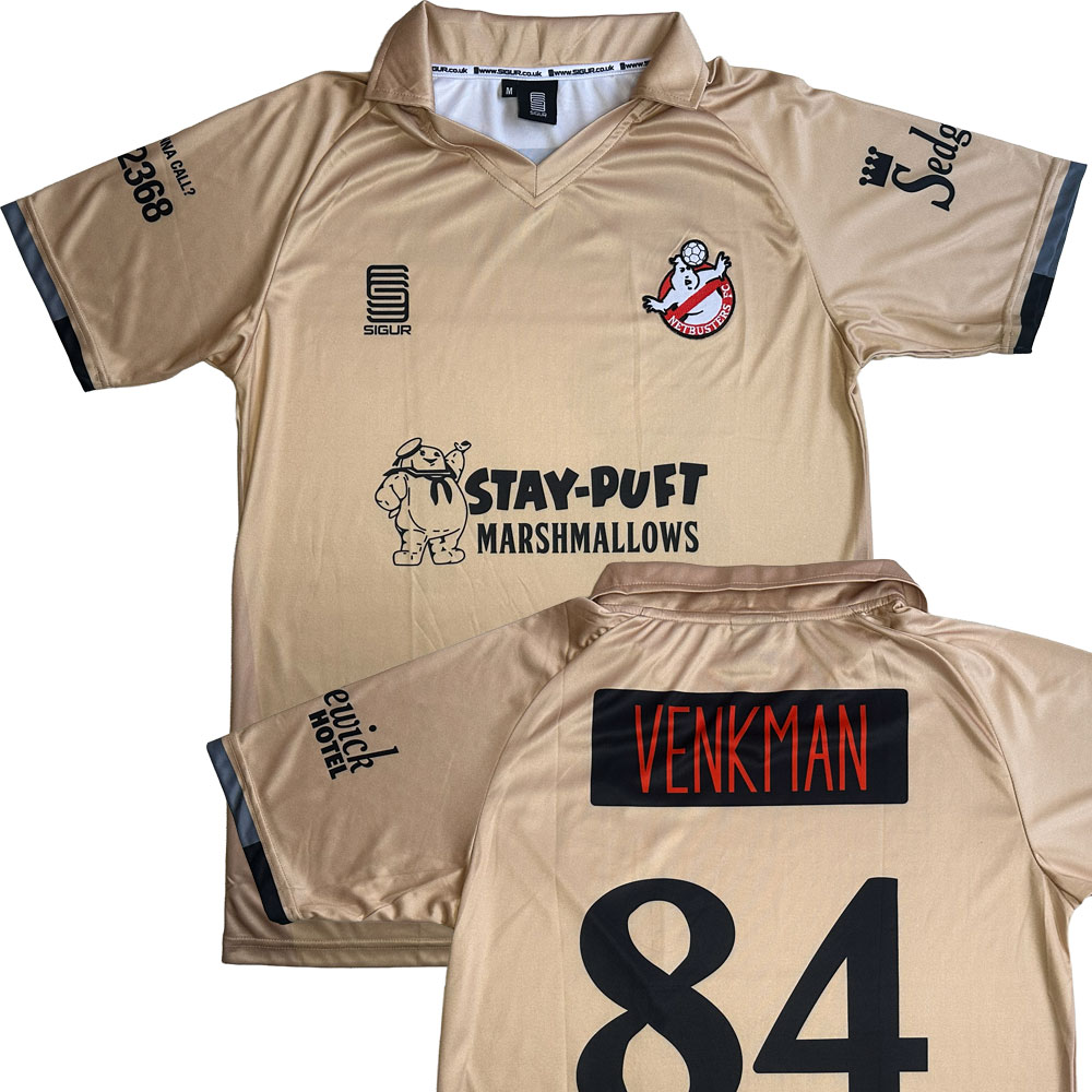 An 80s classic is immortalised in football shirt form with our exclusive "Netbusters FC" kit. The shirt colour pays tribute to the Ghostbusters' uniforms, while the embroidered badge features a football-heading ghost parody of the film logo (with the name "Netbusters" also being influenced by the film title). The front sponsor is "Stay Puft", the marshmallow brand that Ray thinks of when told to choose Gozer's Destructor form. The sleeve sponsor is the Sedgewick Hotel; the establishment that the team trash whilst capturing a ghost.