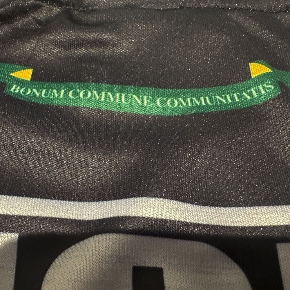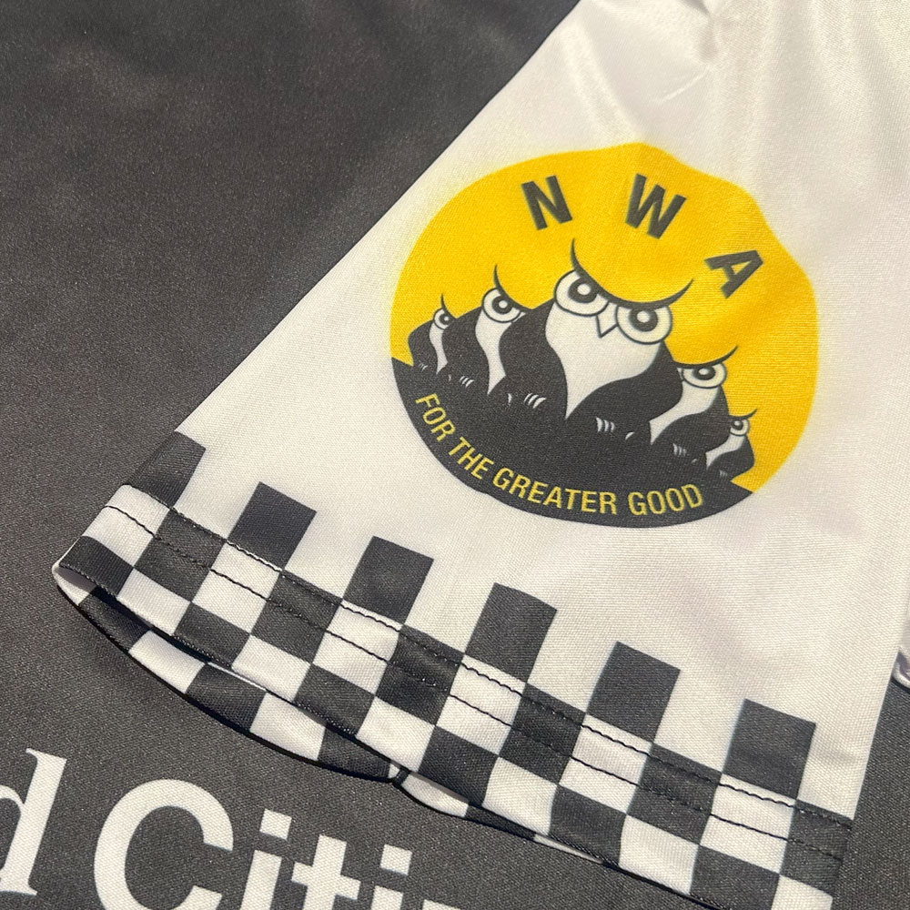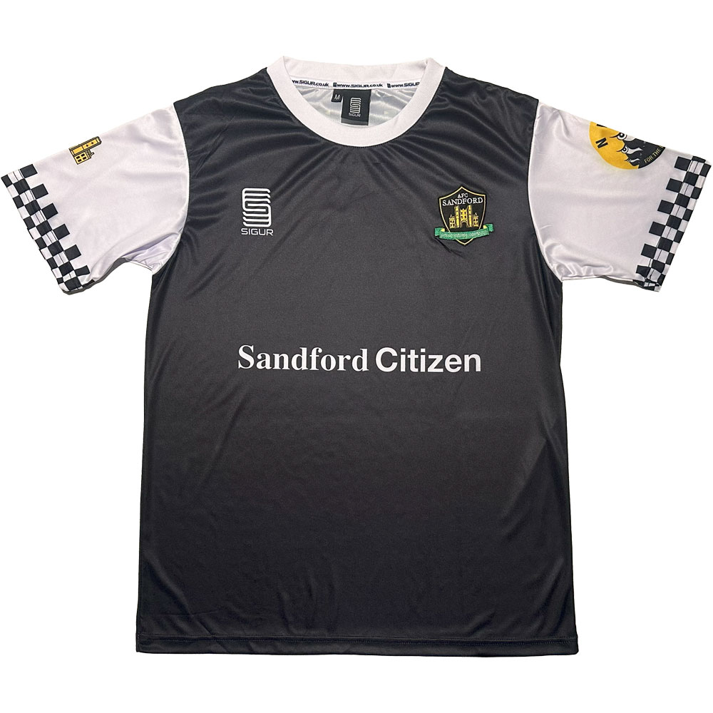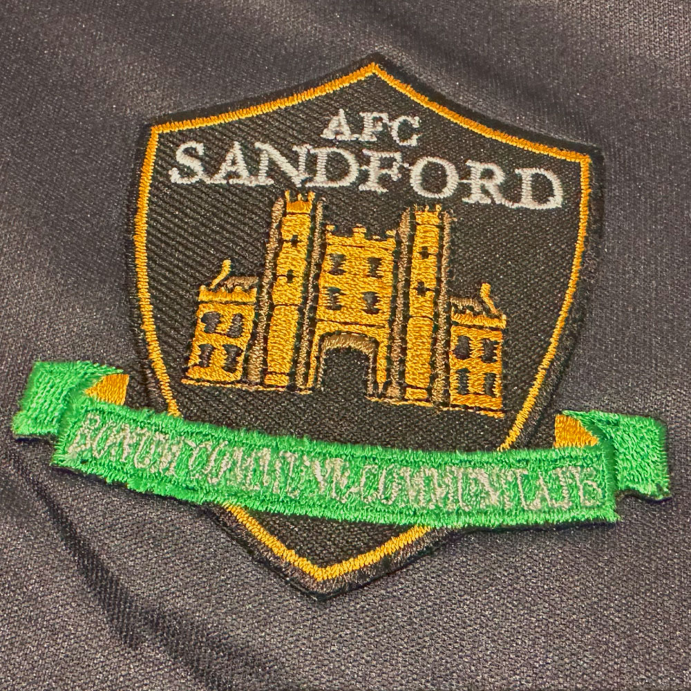 The embroidered badge features the Sandford town crest and the motto "The Greater Good" in Latin underneath. On the front of the shirt the main sponsor, Sandford Citizen, is the name of the local paper, while the sleeve sponsor is "NWA"; the neighbourhood watch group that the town cult belong to.
