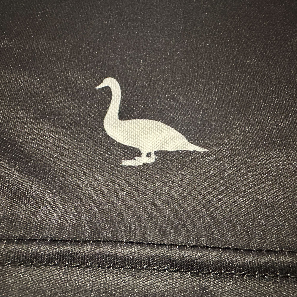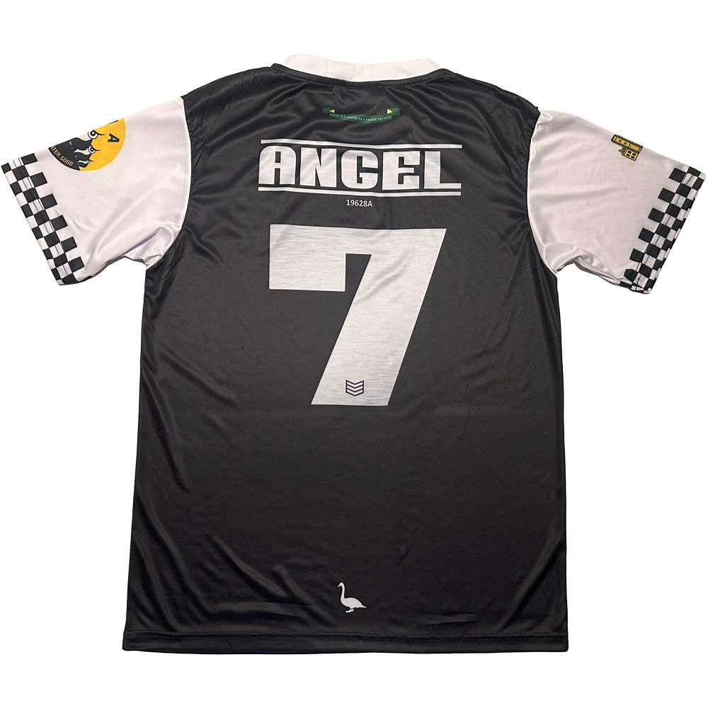 Paying homage to Hot Fuzz, the second film in Simon Pegg's "Three Flavours Cornetto" series, we present the shirt of AFC Sandford. The shirt pattern (black with white sleeves and chessboard detailing) is based on Sgt. Nick Angel's police uniform, whilst the rear of the shirt features his name, warrant number (19628A) and the number seven (the film was released in 2007). At the bottom is a swan motif, representing the stray swan that appears throughout the film.