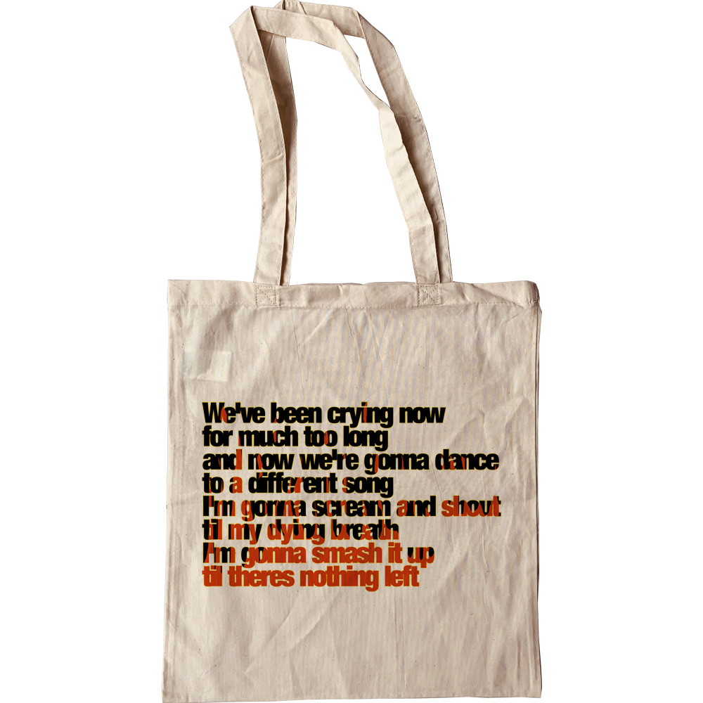 We've been crying now for much too long / And now we're gonna dance to a different song / I'm gonna scream and shout til my dying breath / I'm gonna smash it up til there's nothing left