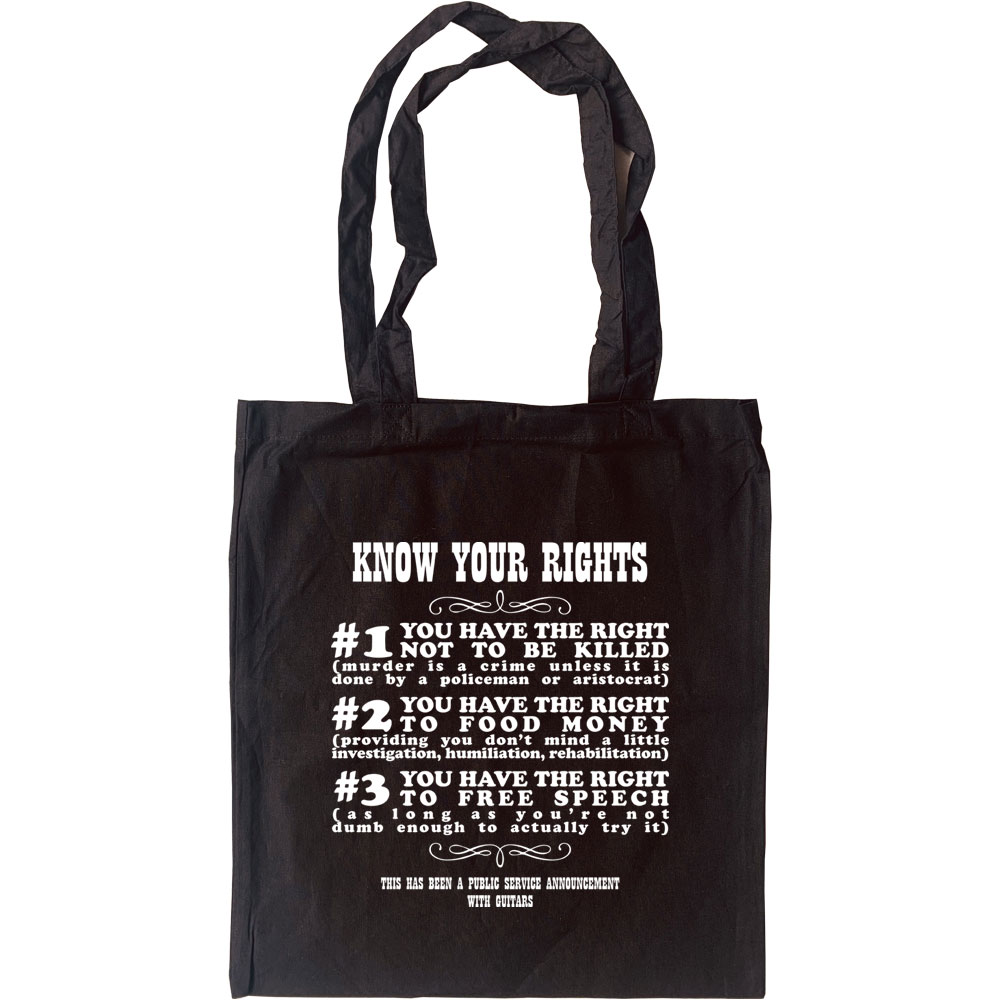Strummer, Jones, et al's advice regarding people's true rights in the modern age: #1 YOU HAVE THE RIGHT NOT TO BE KILLED (murder is a crime unless it is done by a policeman or aristocrat) #2 YOU HAVE THE RIGHT TO FOOD MONEY (providing you don't mind a little investigation, humiliation, rehabilitation) #3 YOU HAVE THE RIGHT TO FREE SPEECH (as long as you're not dumb enough to actually try it). Our design is printed on a 100% cotton, eco-friendly tote bag.