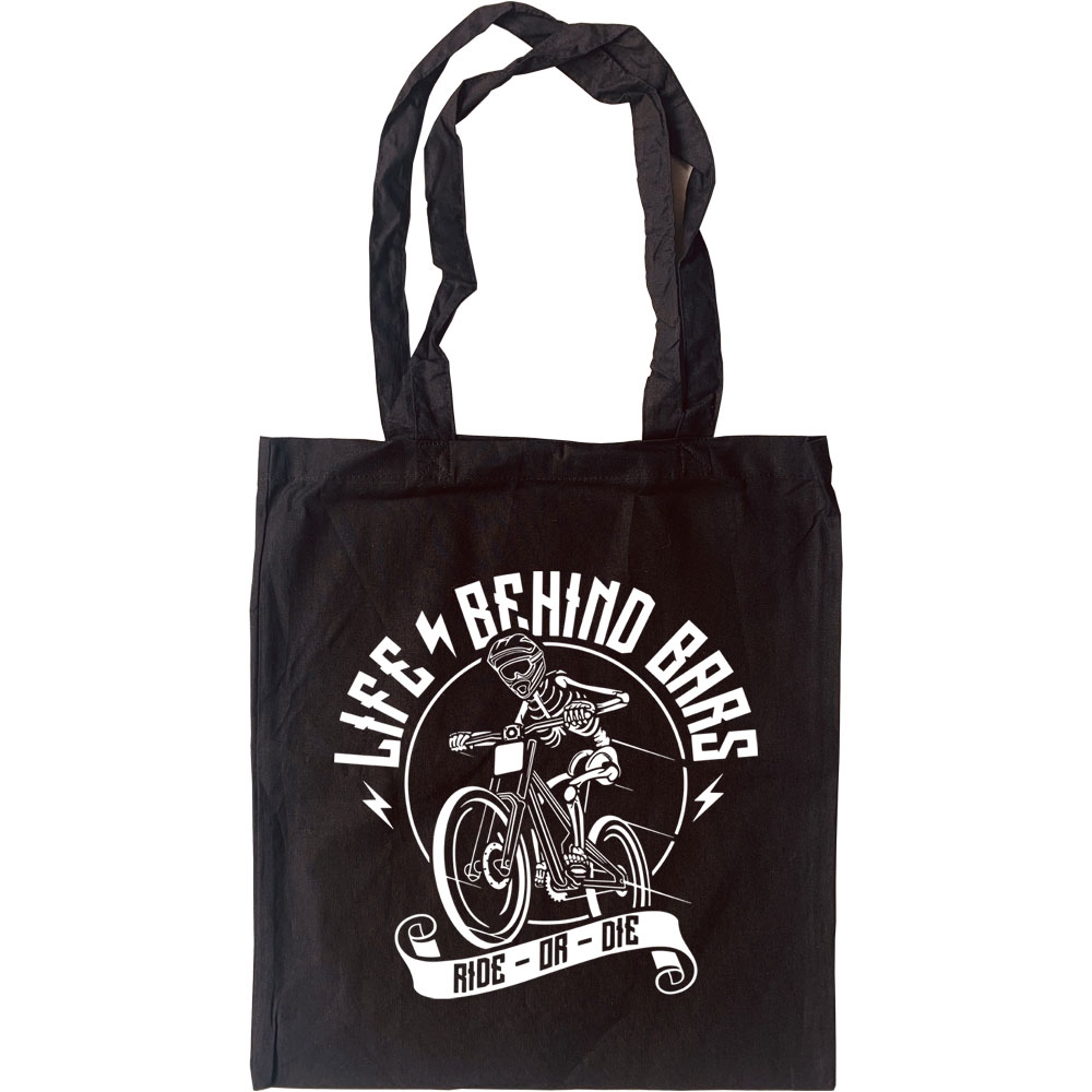 Ride or Die. Live life behind bars: handlebars. An image of a skeleton riding a bicycle beneath the slogan "Life Behind Bars" Our design is printed on a 100% cotton, eco-friendly tote bag.