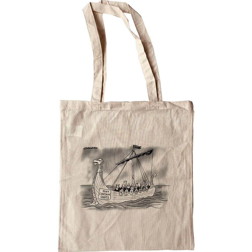 A warning on the Viking longboat: may contain Cnuts. A cartoon by renowned cartoonist Clive Goddard and printed on a 100% cotton, eco-friendly tote bag.
