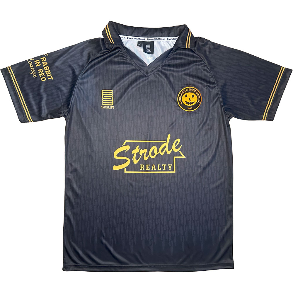 A football shirt inspired by the classic 1978 slasher horror film, Halloween. The embroidered badge features the logo of the fictitious Haddonfield Wanderers FC - Haddonfield being the suburb where the film was set - with the year 1963 (the year of Michael's first kill as a child), and the Jack-o-Lantern image taken from the movie titles. The all-over pattern on the black shirt is inspired by Michael Myers' kitchen knife.