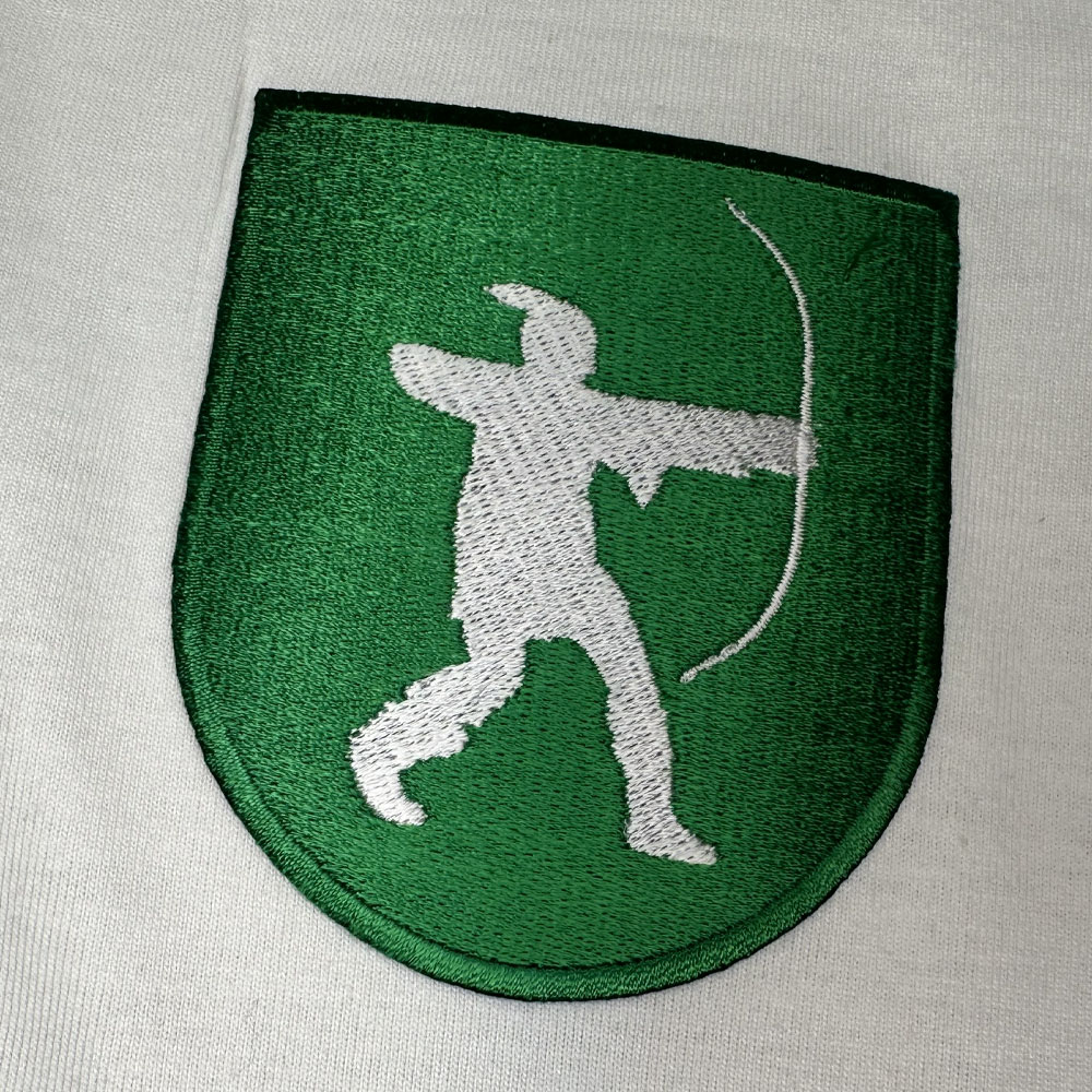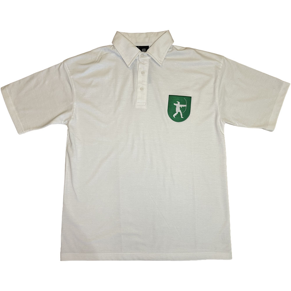 A high-cotton, retro-fit cricket shirt, featuring detailing inspired by the Nottinghamshire flag: a white silhouette of James Woodford's bronze statue of Robin Hood on a green shield.