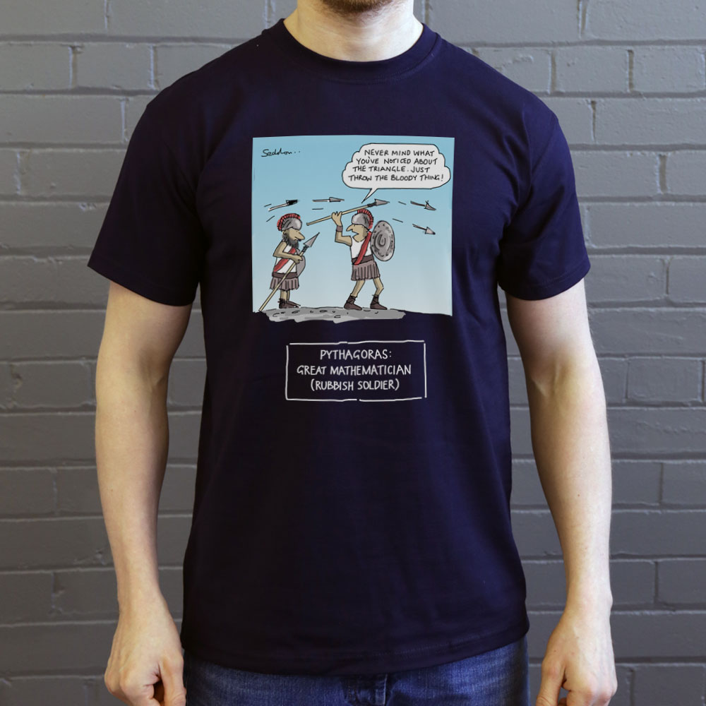 This cartoon confirms that Pythagoras, genius mathematician, was somewhat limited in his soldiering abilities. Part of our range by acclaimed cartoonist Mike Seddon.