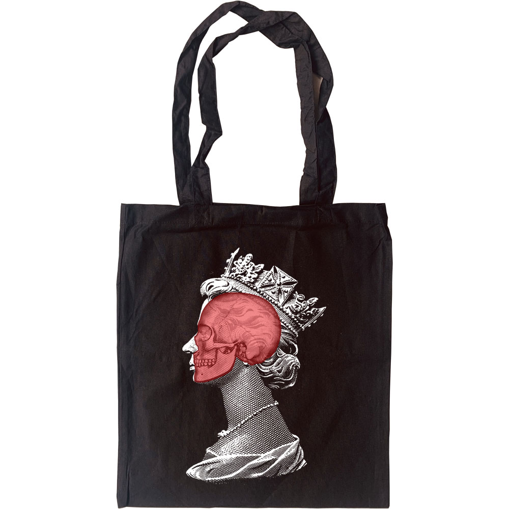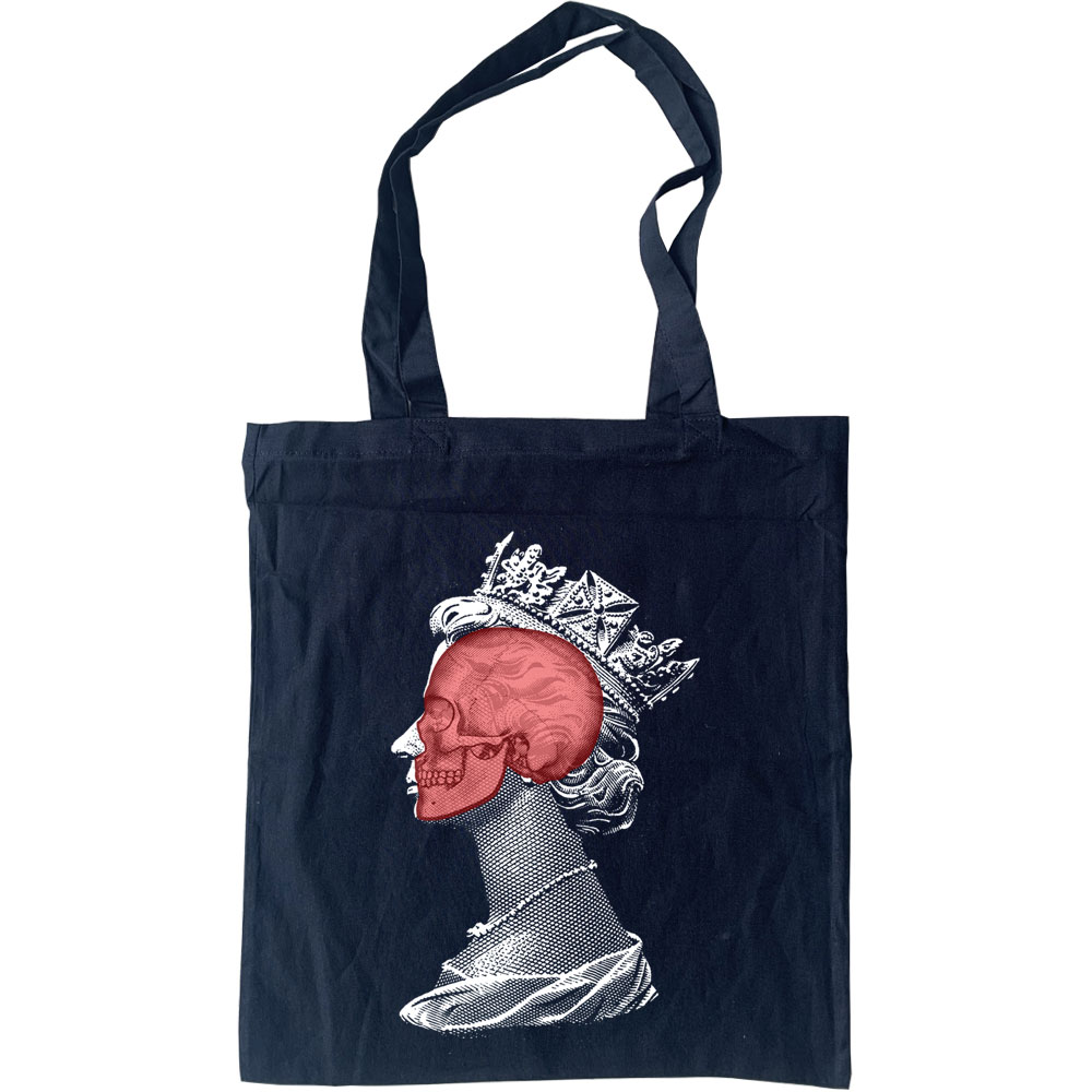 The unmistakable profile image of Queen Elizabeth II, but with a human skull superimposed over her head. Everyone is but flesh and bone and we are all going to end up the same way. Our design is printed on a 100% cotton, eco-friendly tote bag.