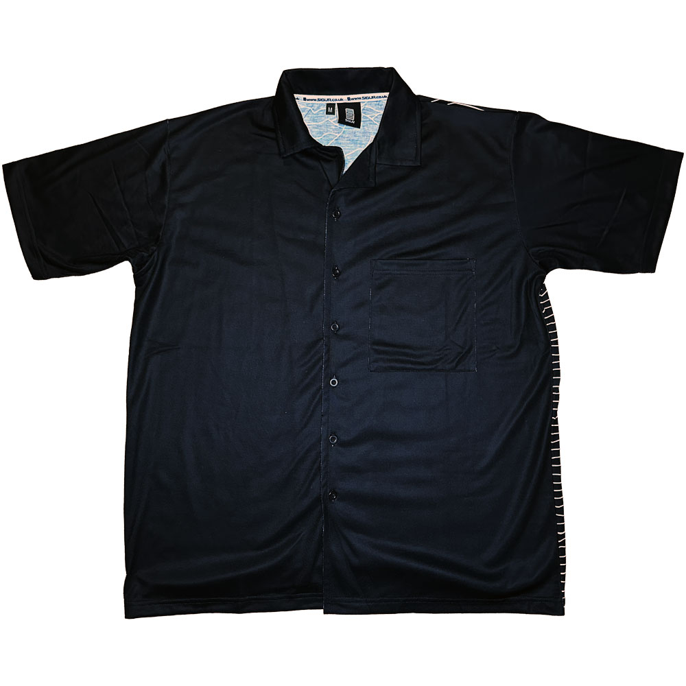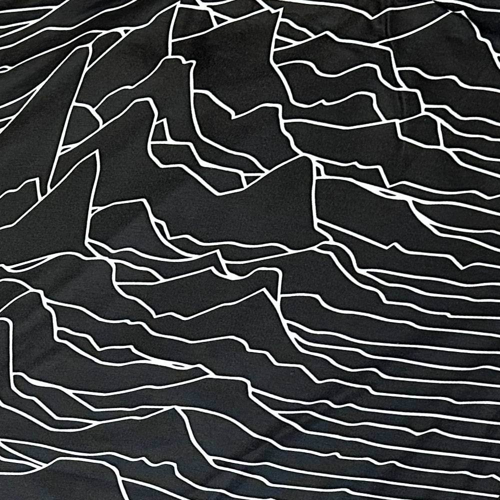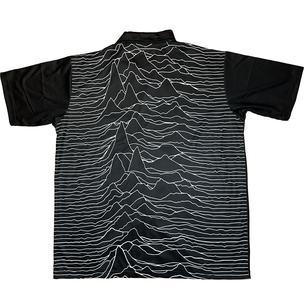 A button-up, revere-collared shirt featuring the CP1919 pulsar pattern made popular on the cover of Joy Division's 1979 album "Unknown Pleasures". The shirt features the black and white pulsar pattern on the rear, with black front and sleeves and a plain black chest pocket.
