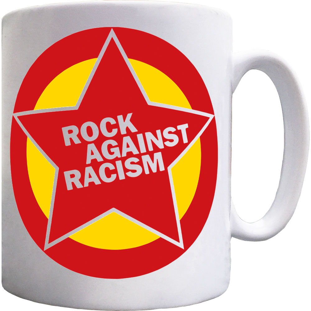 We are delighted to present, produced in collaboration with the designer of the original David King, the famous Rock Against Racism logo. Known throughout Britain and beyond, appearing on the covers of DIY punk 45s, as stickers on guitars (Tom Robinson and Jimmy Pursey the most notable), on banners, and mostly as a badge, thousands and thousands of badges, multi-coloured, multi-sized. Printed on a dishwasher-safe ceramic mug.