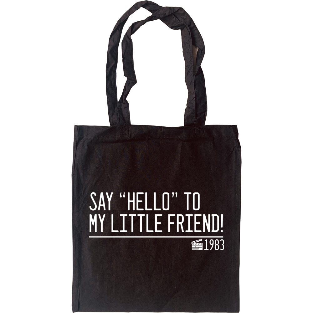 The single most famous line from Scarface (1983), Al Pacino as Tony Montana: "Say 'hello' to my little friend!". Printed on a 100% cotton, eco-friendly tote bag.