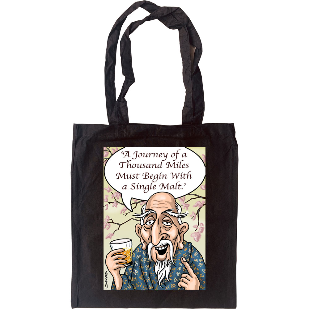 Wise man says: "a journey of a thousand miles must begin with a single malt". A cartoon by renowned cartoonist Clive Goddard and printed on a 100% cotton, eco-friendly tote bag.