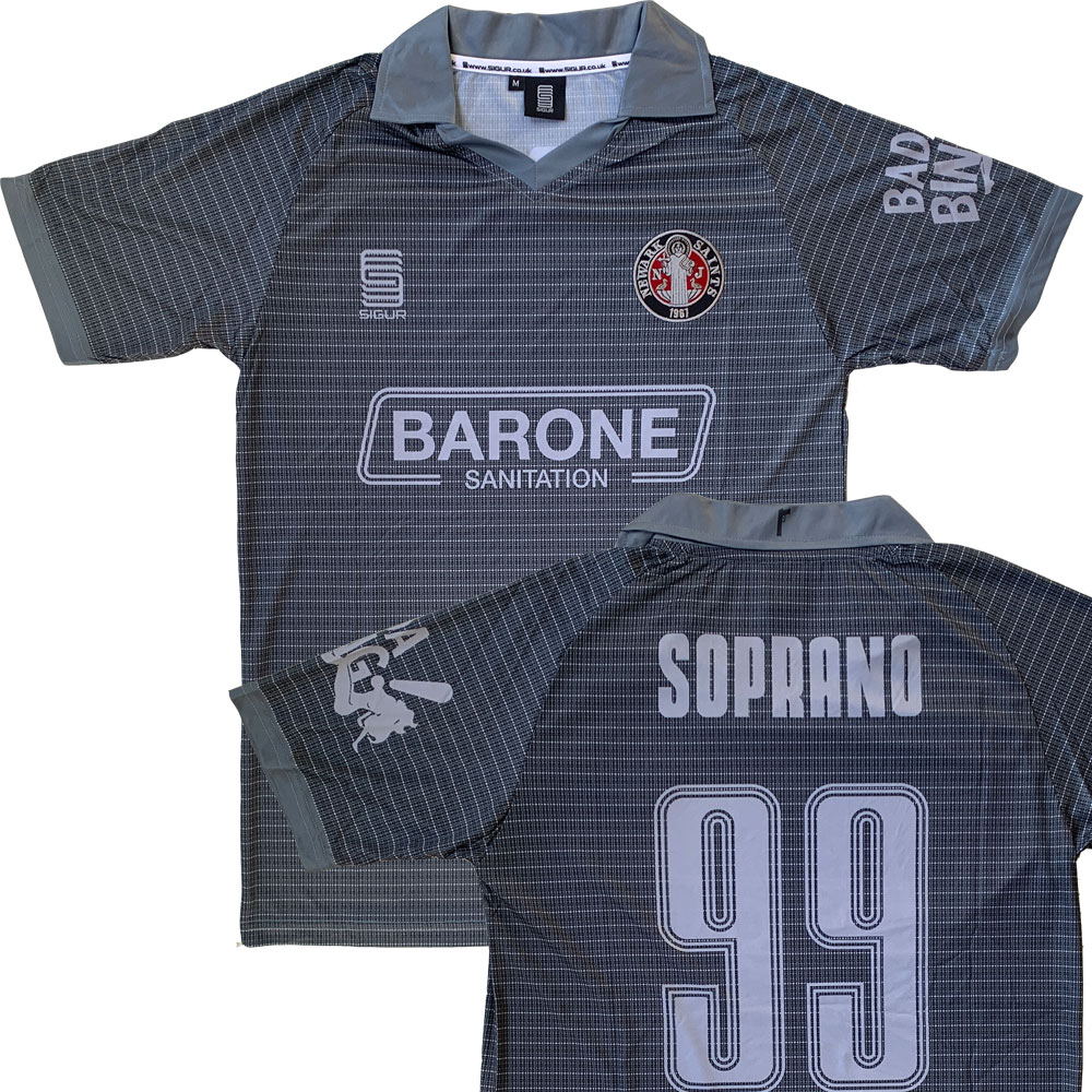 Our football shirt tribute to one of the greatest characters in television history: Tony Soprano. The embroidered logo is of the fictitious Newark Saints Football Club (the name itself being inspired by the spin-off movie "The Many Saints of Newark", with the year of founding, 1967, being the year that the film begins). The main sponsor on the front of the shirt is the logo of Soprano's Barone Sanitation front company, while the smaller sleeve sponsor is the logo of the Bada-Bing, the strip club owned and chiefly operated by Silvio Dante, Tony's consigliere. There is a duck printed at the bottom of the back of the shirt, in reference to the ones which are a constant presence throughout the series (and widely considered a metaphor for family), while the back of the collar features a gun similar to that in The Sopranos' logo. The pattern of the shirt is inspired by one of the polo shirts worn by the protagonist in the series, while the name and number on the rear, "Soprano 99", reference Tony Soprano himself and the year that the series started (as well as the year that Tony becomes an underboss in the DiMeo crime family).
