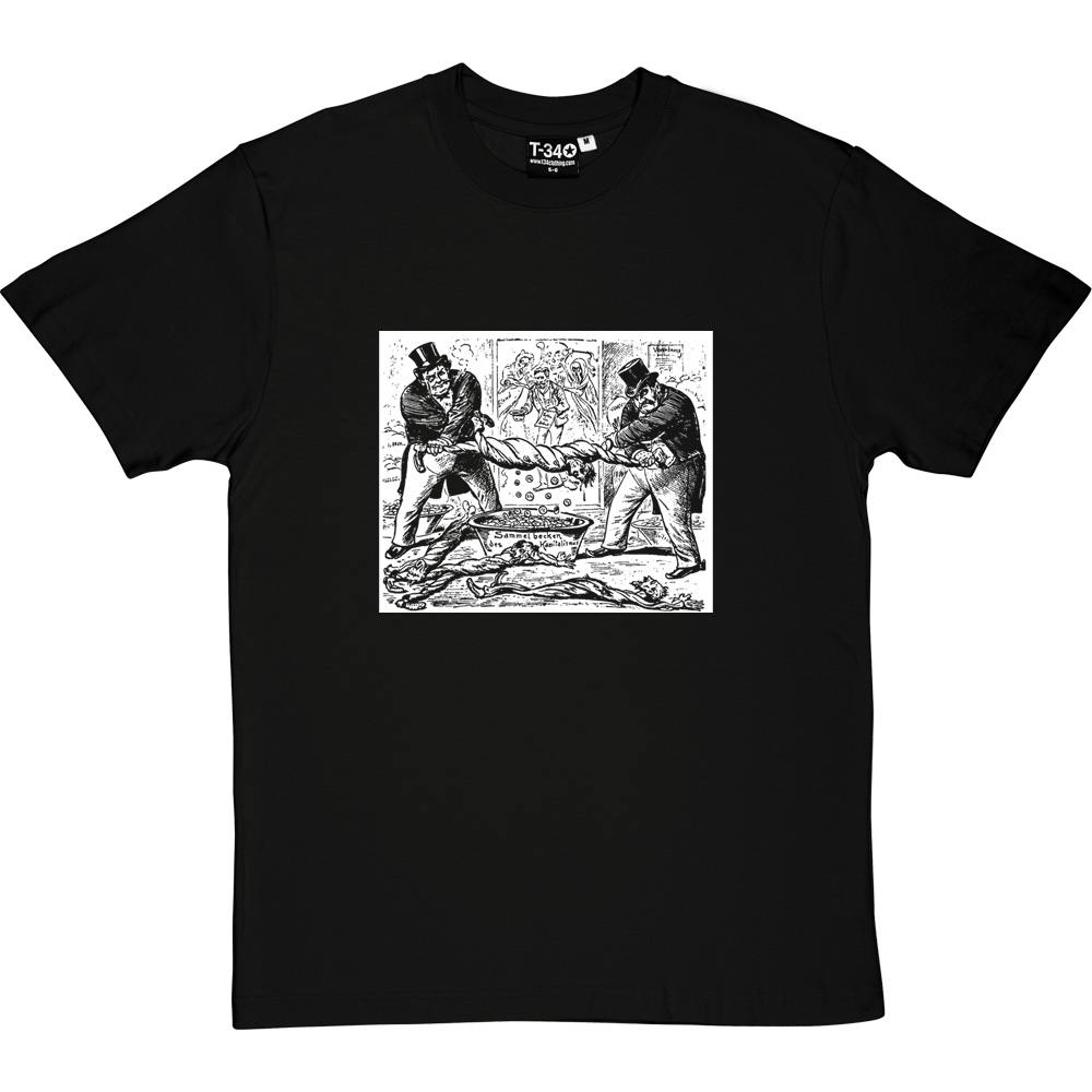 A cartoon originally published in Der Neue Postillon (The New Messenger) in Zurich, Switzerland, in 1896, depicting two fat-cat businessmen squeezing money from a poor worker over a pot captioned "Sammel Becken des Kapitalismus" ("Reservoir of Capitalism"). The original title for the cartoon was "The New Relationship Between Workers and Business Owners"