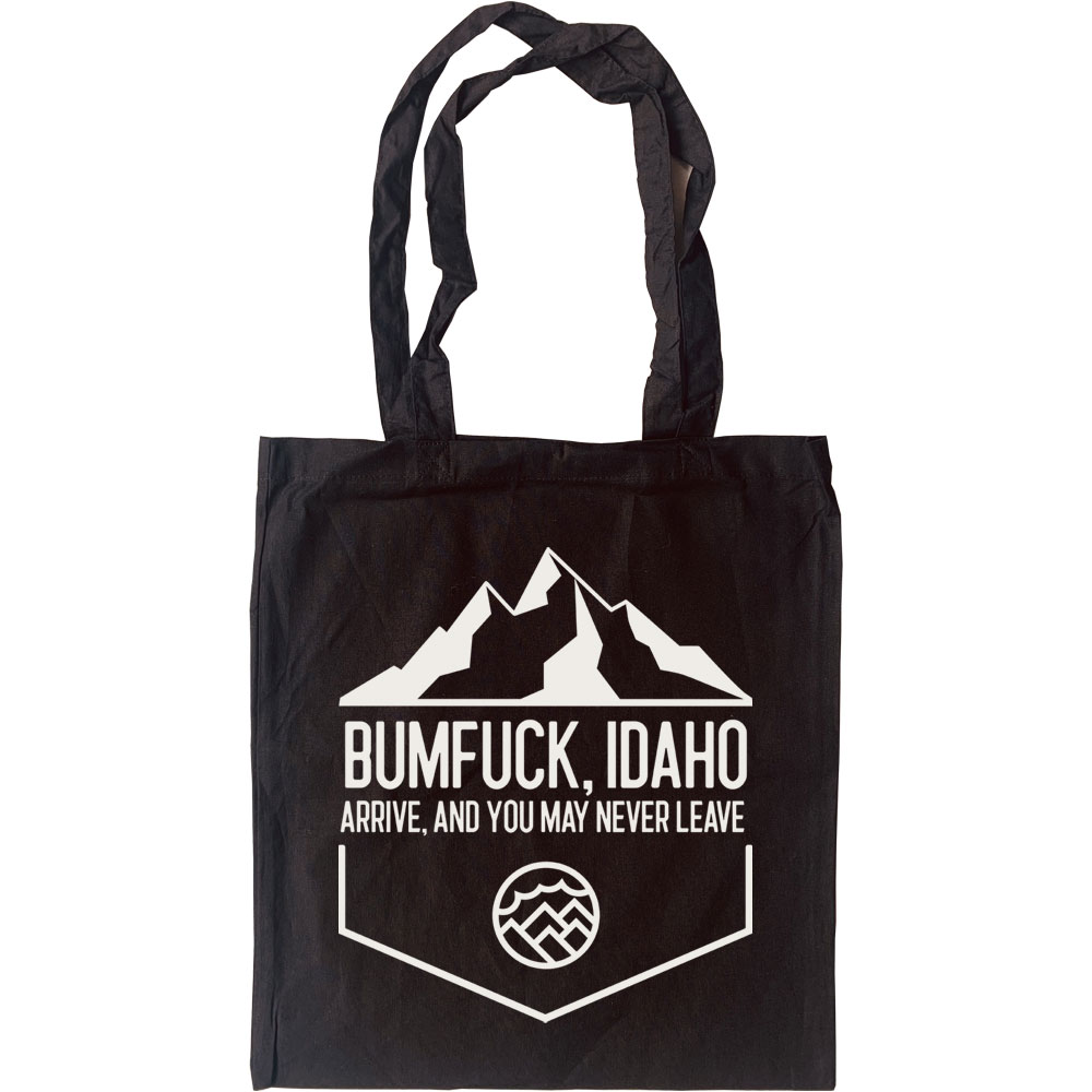 Shorthand for the hick town that's right slap-bang in the middle of nowhere, the sleepy place whose, somewhat sinister, motto is emblazoned on the front of the design: "Arrive, and you may never leave". Our design is printed on a 100% cotton, eco-friendly tote bag.