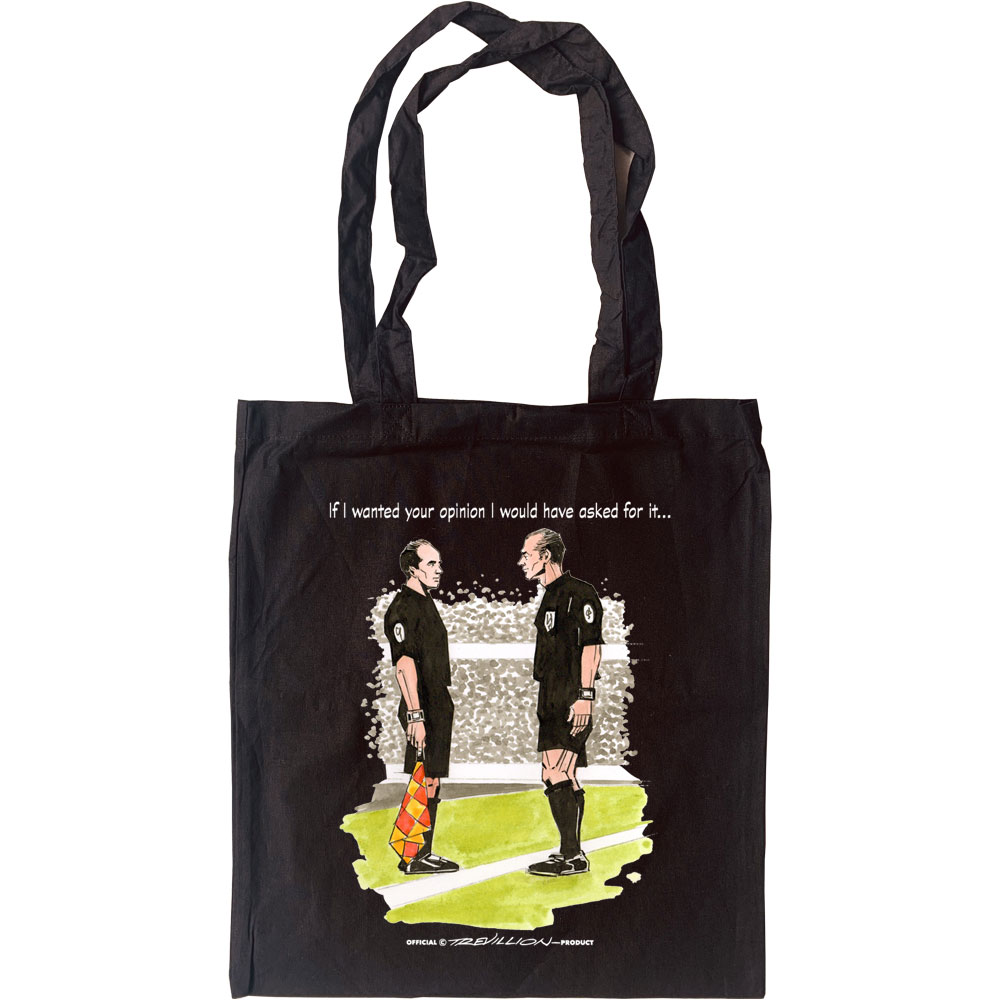 World-renowned sports artist Paul Trevillion, creator behind the cult classic football feature You Are The Ref illustrates in humorous, distinctive and unmistakable style, the Referee and the Assistant Referee (with flag).   Our design is printed on a 100% cotton, eco-friendly tote bag.